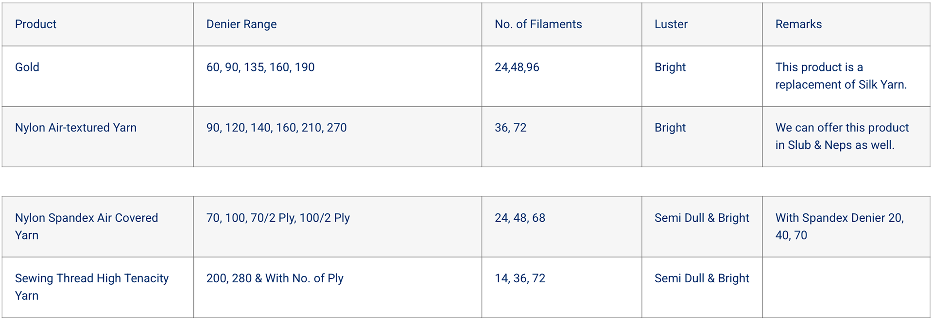 Our Nylon Dyed Yarns are available in a full range of colors, textures, and deniers. We also provide a variety of twists, ply's and spandex blends.